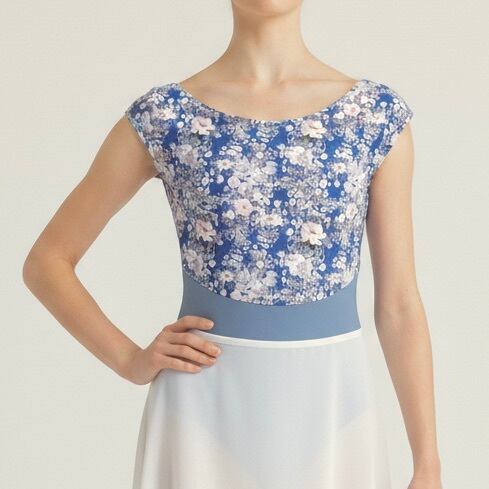 前身頃にはコバルトローズのプリント柄を後ろ身頃にはごく淡いパウダーアクアのメッシュを合わせ前後で異なる表情を楽しめるデザインです。胸下の切替から下は無地のブルーグレーでまとめプリントの魅力を引き立てながら全体をすっきりと整えています。