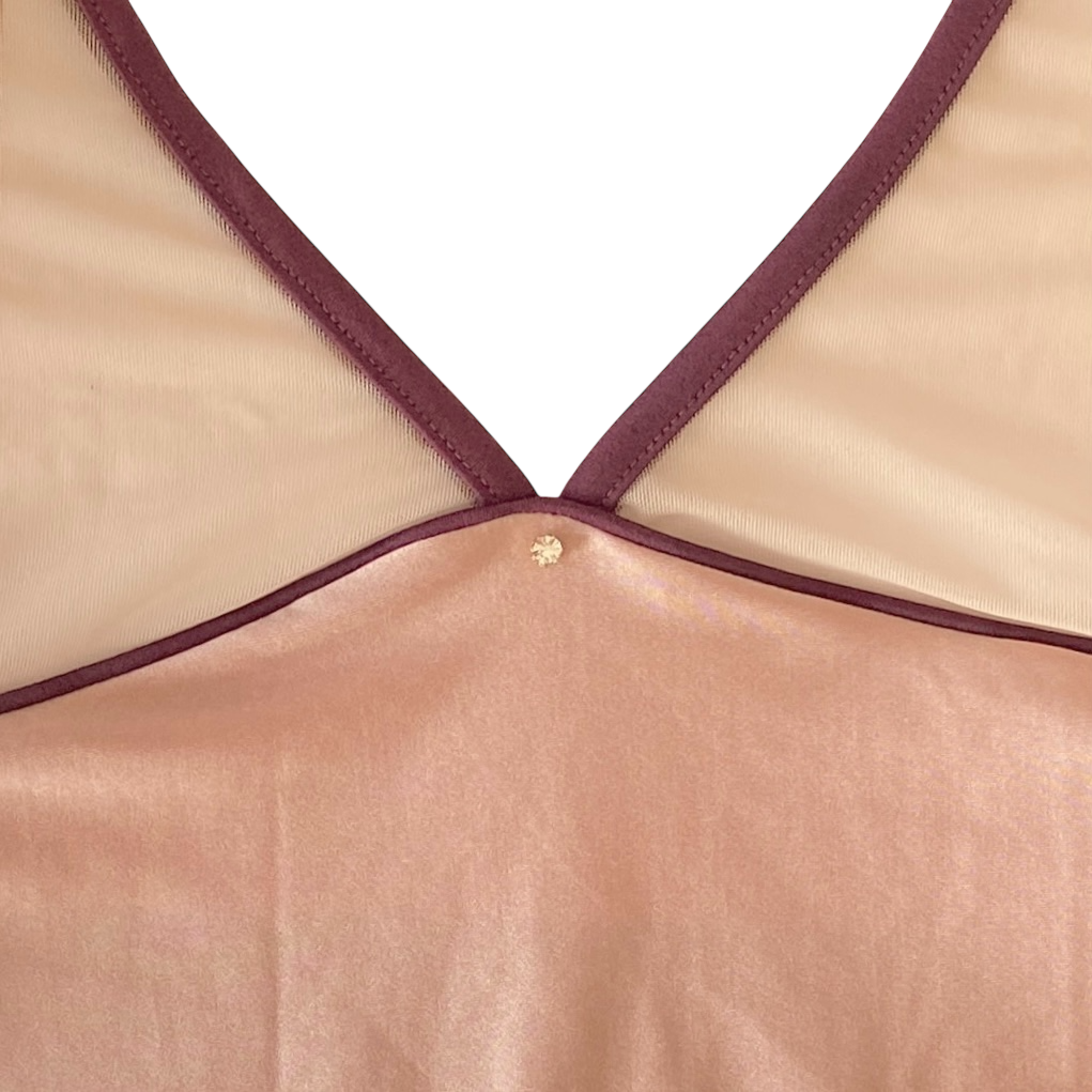 前身頃は切替上にメッシュとレオタード生地を重ねたレイヤー仕様、背中はV字開きのデザインでVが際立つ山形の切替のデザイン。切替やネックライン、背中まわりのパイピングが上品なアクセントになります。後ろの切替中心のラインストーンが無地ベースにささやかやきらめきを添えています。基本の袖はノースリーブ。軽やかさと動きやすさを活かしシャープで洗練された印象に仕上げています。切替上・袖がメッシュになります。