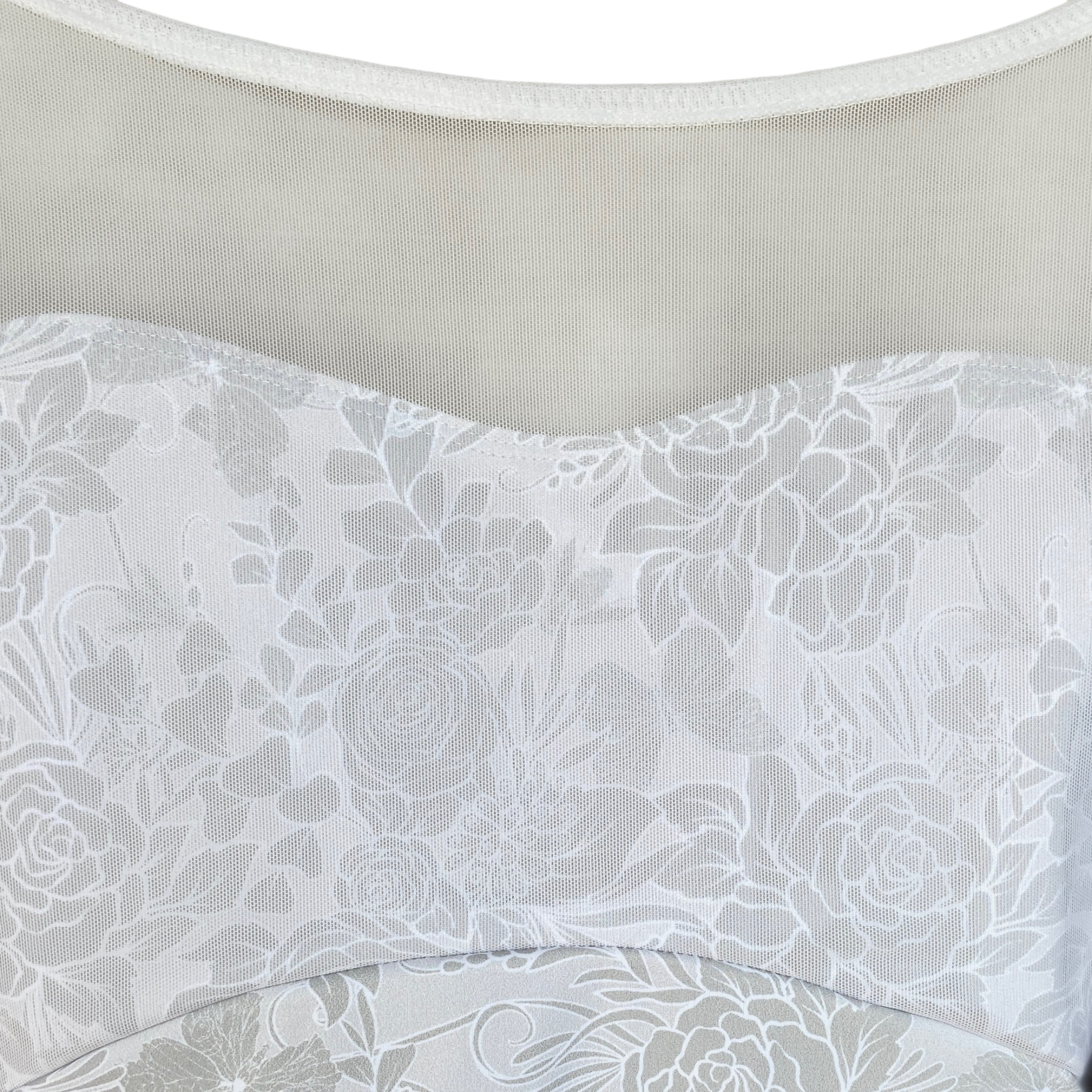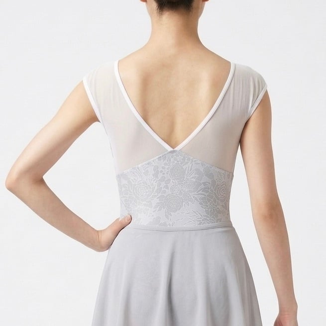 繊細なフローラルプリントのサイレンストレースにホワイトメッシュを重ね上品で軽やかな印象に仕上げました。ボートネックがデコルテを美しく見せプチフレンチスリーブがさりげなく肩まわりをカバーします。やさしい色合いの中にも奥行きがあり日常のレッスンにも自然に馴染むデザインです。
